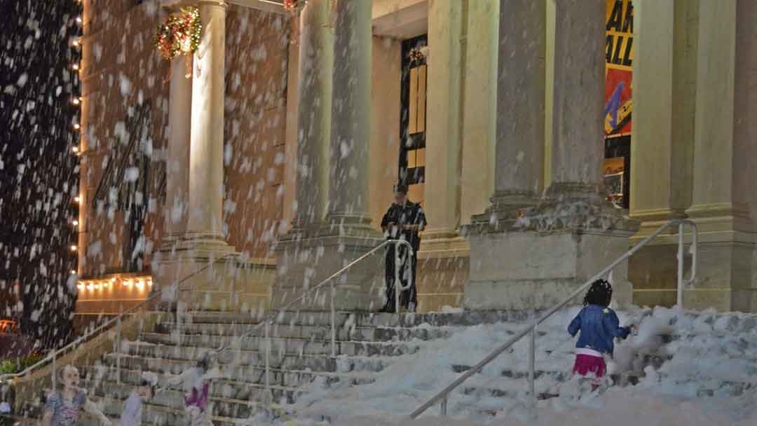 Join us this holiday season in downtown Pensacola for Winterfest, where snow flurries fill the air at the corner of Government and Palafox streets.